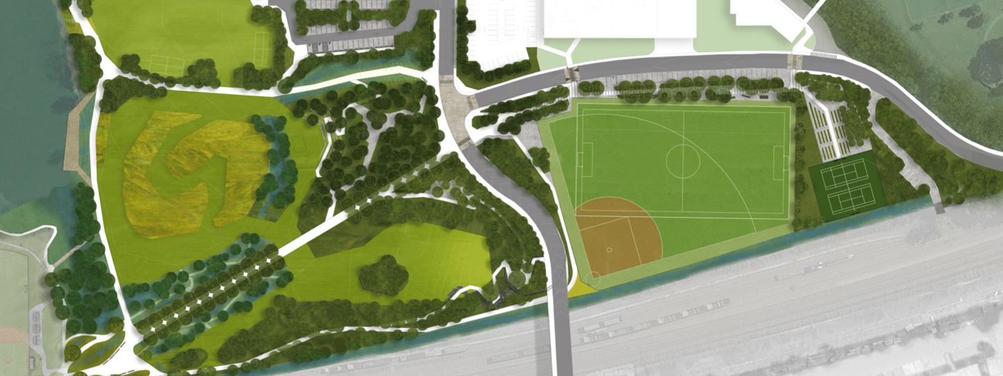 A schematic design was prepared by Margie Ruddick Landscape Architect. The plan entails the creation of 20 acres of parkland which will include ball fields, trails, open space, plantings, and other passive and active recreational features.
